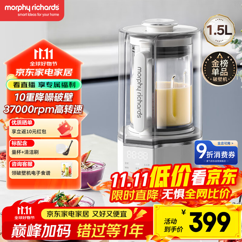 包邮 摩飞电器(Morphyrichards)破壁机 家用1.5L多功能柔音豆浆机加热全自动榨汁机搅拌机 3-4人预约保温隔音降噪辅食机MR8201白